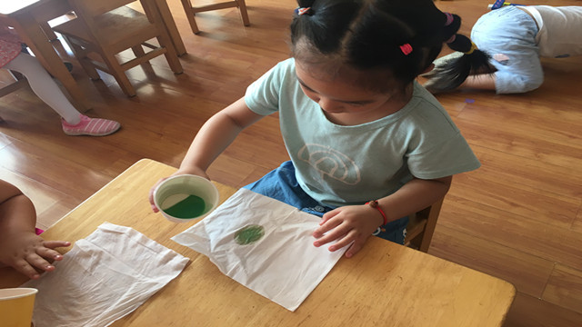 在本次活动中幼儿知道了两种颜色混合后会发生不同的变化,并且自己会动手给餐巾纸印染颜色,感受印染作品的美感与快乐。(撰写人:徐莹/陈玲 审核人:蒋欢)