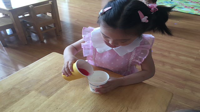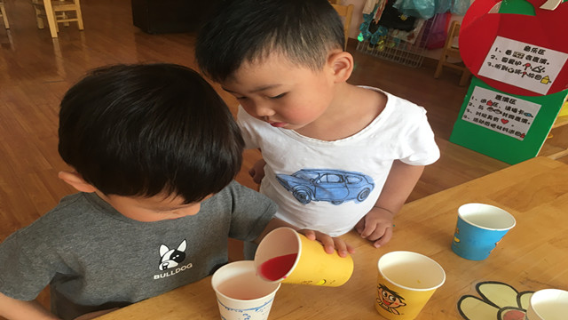 “如果我们把红色和蓝色的水放在一起会发生什么事情呢?我们一起来尝试一下吧。”于是,老师就在一个空空的杯子到了一点红色的水,然后又加了点蓝色的水,然后杯子摇一摇,接下来就是我们见证奇迹的时候啦,这个杯子的水发生什么情况啦?“它变颜色了,变成紫色了耶!”“对了,它的颜色变了,接下来请我们的宝贝亲子动手看看其他颜色混起来会不会也像刚刚一样颜色变成其他颜色了。”过了没多久一个小朋友跑到老师这儿说:“老师你看,我把蓝色和黄色混在一起变出绿色来了耶!”“我变出橙色出来了耶!”接着,老师请小朋友给白色的餐巾纸染上漂亮的颜色,让宝贝们感受印染作品艳丽的色彩与朦胧的美感。一个个别提多激动了,都拿出自己的想法把白色的纸上染上漂亮的颜色。