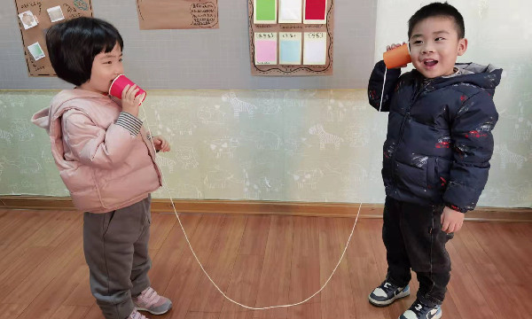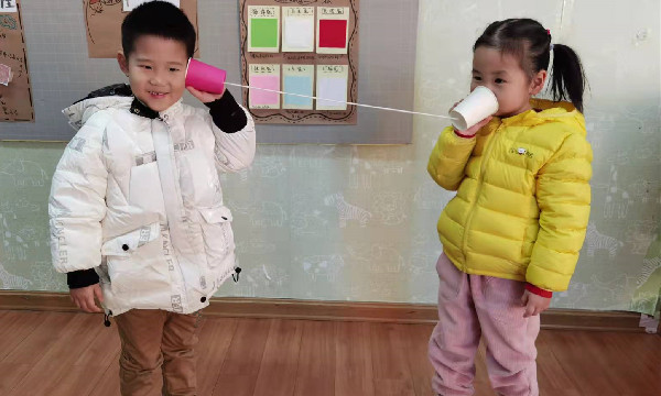 1月15日,彩虹幼儿园中二班开展了“奇妙的传声筒”科学探索活动,传声筒是利用了声音通过固体传播的原理,当我们的声音传出,纸杯能够有效地将声音聚集起来,并且减少声音的扩散,让声音经过中间的绳子最后传进另一端的纸杯中。